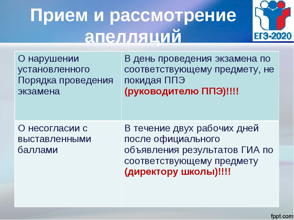 В целях обеспечения соблюдения единых требований и разрешения спорных вопросов при оценке экзаменационных работ Министерством образования и науки Чеченской Республики утверждён порядок подачи апелляций о несогласии с результатами ЕГЭ. Апелляция подаётся участником ЕГЭ в образовательную организацию по месту обучения не позднее указанных ниже сроков: • География, литература, информатика – с 18.07.2020 по 20.07.2020 • Русский язык (экзамен 06.07.2020) - с 21.07.2020 по 22.07.2020 • Русский язык (экзамен 07.07.2020) – с 24.07.2020 по 25.07.2020 • Математика (профильный уровень) – с 27.07.2020 по 28.07.2020 • История, Физика – с 28.07.2020 по 29.07.2020 • Обществознание, Химия – с 31.07.2020 по 01.08.2020 • Биология, Иностранные языки (письменно), Иностранные языки (устно) - с 03.08.2020 по 04.08.2020 • Резерв по всем учебным предметам кроме русского и иностранного языков – с 04.08.2020 по 05.08.2020 • Резерв по всем учебным предметам - с 04.08.2020 по 05.08.2020 Выпускники прошлых лет подают заявления в районный отдел образования. Конфликтная комиссия (КК) не рассматривает апелляции по вопросам содержания и структуры заданий КИМ по учебным предметам, а также по вопросам, связанным: • с оцениванием результатов выполнения заданий экзаменационной работы с кратким ответом; • с нарушением непосредственно самим участником экзаменов требований порядка проведения ГИА-2020; • с неправильным заполнением бланков ЕГЭ и ГВЭ. КК также не рассматривает листы бумаги для черновиков в качестве материалов апелляции о несогласии с выставленными баллами. Подробную информацию о приёме и порядке рассмотрения апелляций смотрите в разделе "ЕГЭ/ОГЭ"