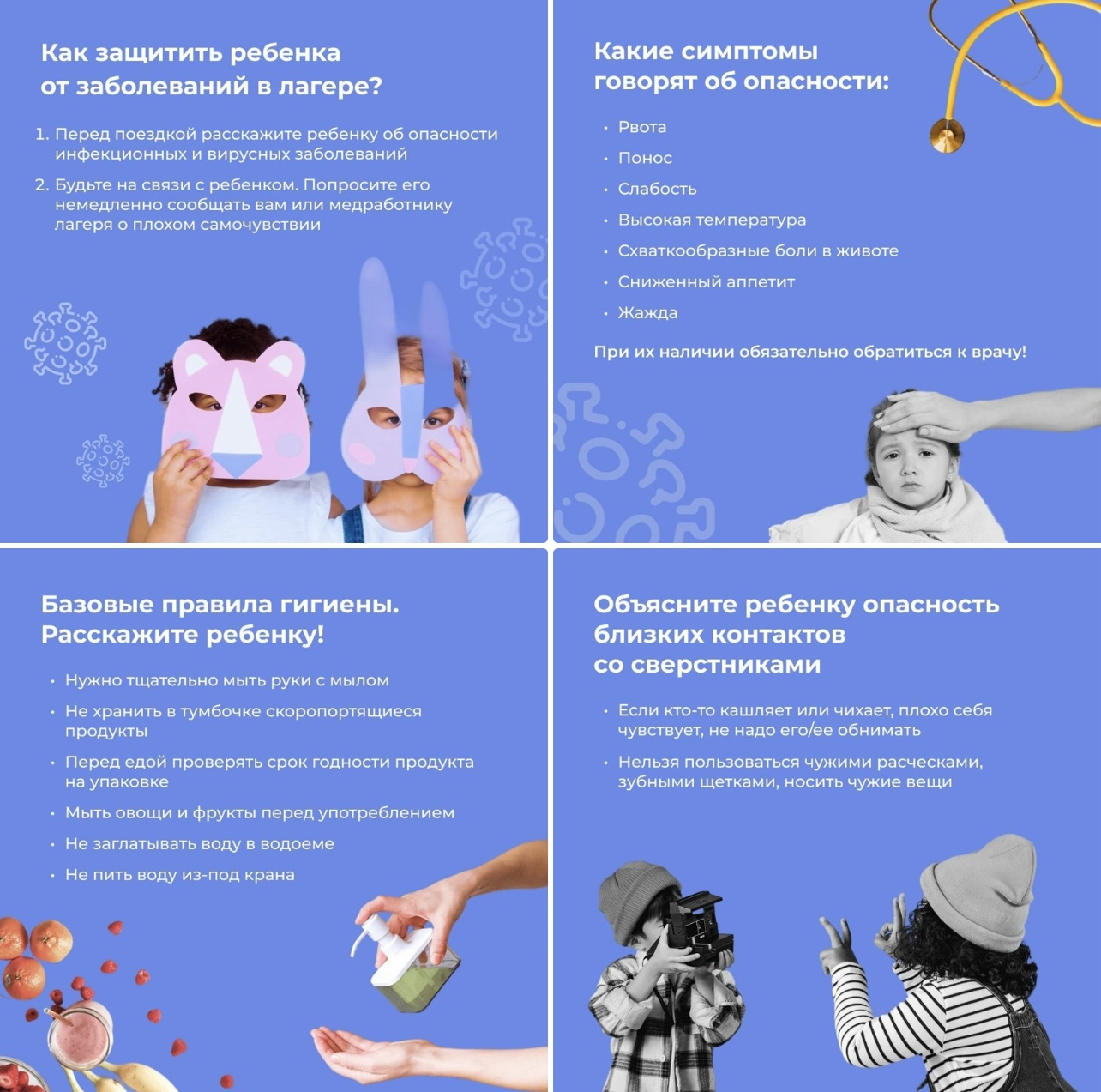 11.07.2023В Чеченской Республике разгар летней оздоровительной кампании. В этом году более 15 тысяч детей отдохнут в четырех детских лагерях, отвечающих всем необходимым санитарным требованиям. Однако дети есть дети, и во время игр они забывают о правилах гигиены. Самое время напомнить им о этом. В карточках собрали основную информацию, как защитить ребенка от заболеваний во время отдыха.