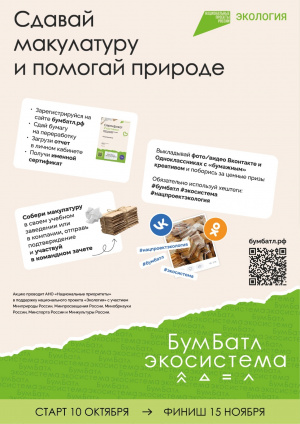 11.10.2023Четвертый сезон акции «БумБатл» стартует 10 октября. В этом году масштабный экологический проект организован АНО «Национальные приоритеты» совместно с Всероссийским экологическим общественным движением «Экосистема». Ключевая цель акции – сокращение излишнего потребления бумаги, организация системы ее переработки и формирование экологической культуры. В новом сезоне целевая аудитория акции расширится – принять участие смогут не только школьники, студенты, воспитанники детских садов, но и каждый житель страны. Бумагу будут сдавать и представители крупных производственных предприятий, бизнеса и общественных организаций. Коллективные заявки на участие принимаются с 10 октября по 2 ноября. Побороться за первенство в индивидуальном зачете можно с 10 октября по 15 ноября. «Акция "БумБатл" традиционно проводится в поддержку нацпроекта "Экология". Присоединиться к проекту может каждый – как самостоятельно, так и в составе организаций. Помощь в сборе и переработке макулатуры проекту окажут представители ключевого регионального оператора. Как и в прошлом году, мы надеемся увидеть в числе участников тысячи воспитанников детских садов, школ, колледжей, вузов, а также представителей частных компаний, заинтересованных в сохранении природных ресурсов», – отметила генеральный директор АНО «Национальные приоритеты» София Малявина. В рамках «БумБатла» волонтеры Всероссийского экологического общественного движения «Экосистема» проведут серию экологических мероприятий в каждом регионе страны. Участники акции будут сдавать макулатуру, что поможет сократить объемы мусорных полигонов и помочь сохранить лесной фонд России. По словам сопредседателя движения «Экосистема» Андрея Руднева, акция привлекает внимание не только ориентированной на охрану окружающей среды молодёжи. «Уже на подготовительном этапе акции видно, насколько молодые россияне вовлечены в экологические вопросы и в экологическую политику, что не может не радовать. Молодые люди прекрасно представляют, сколько нужно вырубленных деревьев для производства бумаги. Поэтому для сохранения экологии самым правильным решением является использование вторсырья. Сбор макулатуры становится экологическим трендом. Поэтому в рамках акции "БумБатл" мы планируем запустить несколько интересных и вовлекающих в повестку мероприятий», – сказал Андрей Руднев. Чтобы принять участие в акции «БумБатл», необходимо зарегистрироваться на сайте бумбатл.рф. При регистрации нужно указать организацию или подтвердить самостоятельное участие, затем выбрать на интерактивной карте ближайший пункт приема и отнести бумагу туда. По итогам акции оргкомитет определит лидеров по объемам сданного бумажного сырья среди детских садов, школ, ссузов, вузов, компаний и в индивидуальном зачете. Всех участников акции ждут подарки. Также будут объявлены самые результативные регионы страны. Акция «БумБатл» проходит в поддержку национального проекта «Экология» при участии Минприроды России, Минпросвещения России, Минобрнауки России, Минкультуры России и Минспорта России. Экологический партнер акции – ППК «Российский экологический оператор». Всероссийскую акцию по сбору макулатуры в 2023 году поддерживают: Московский театр мюзикла, Госкорпорация «Росатом», Сбербанк, Почта России, ГК Росвод